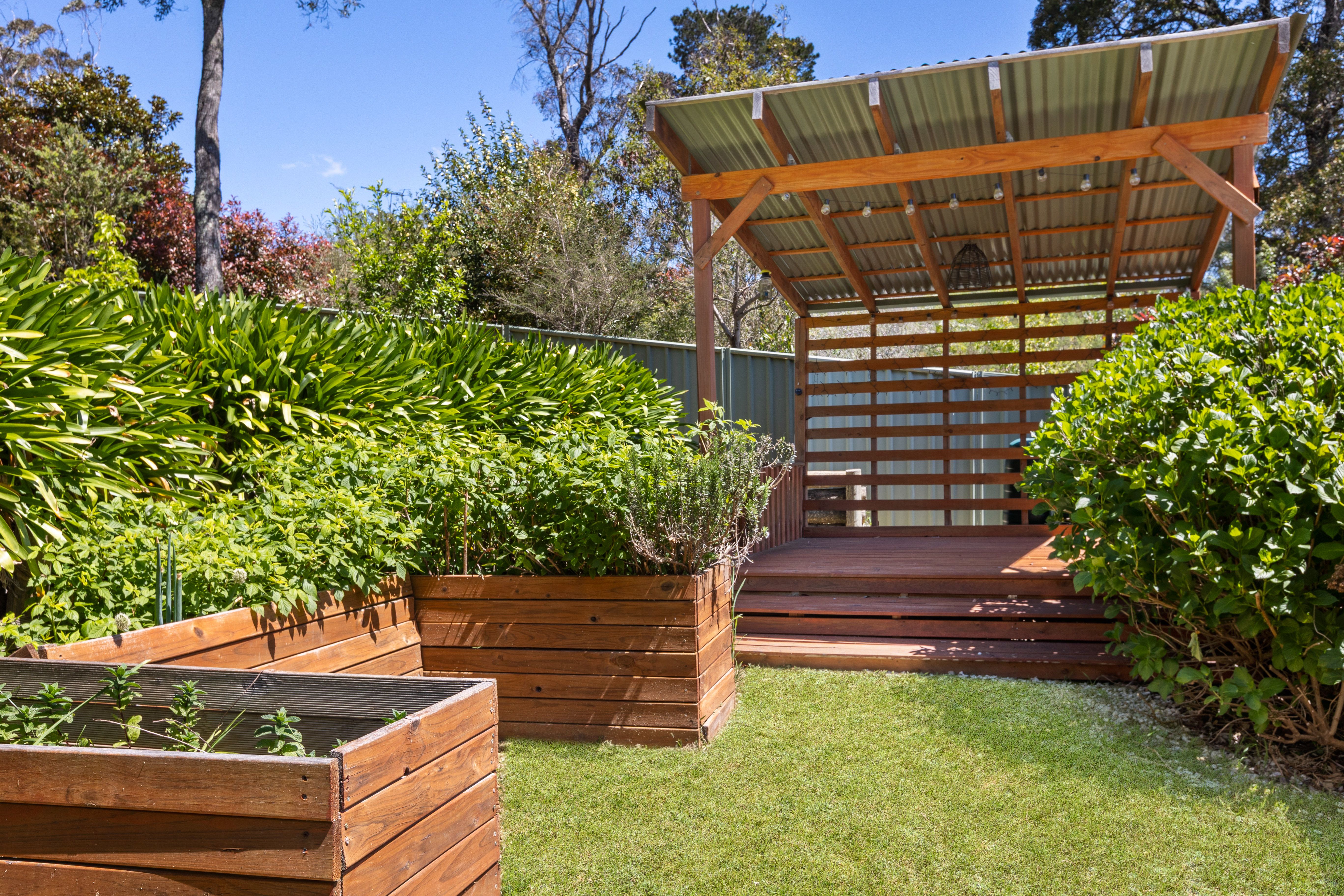 The elevated 721sqm block captures abundant sunshine and features multi-level fenced gardens, gorgeous lawns, raised vegetable beds and water tanks for sustainable living. A lovely gazebo perched at the rear offers the perfect vantage point to take in the tranquil national park surroundings and sunsets.
