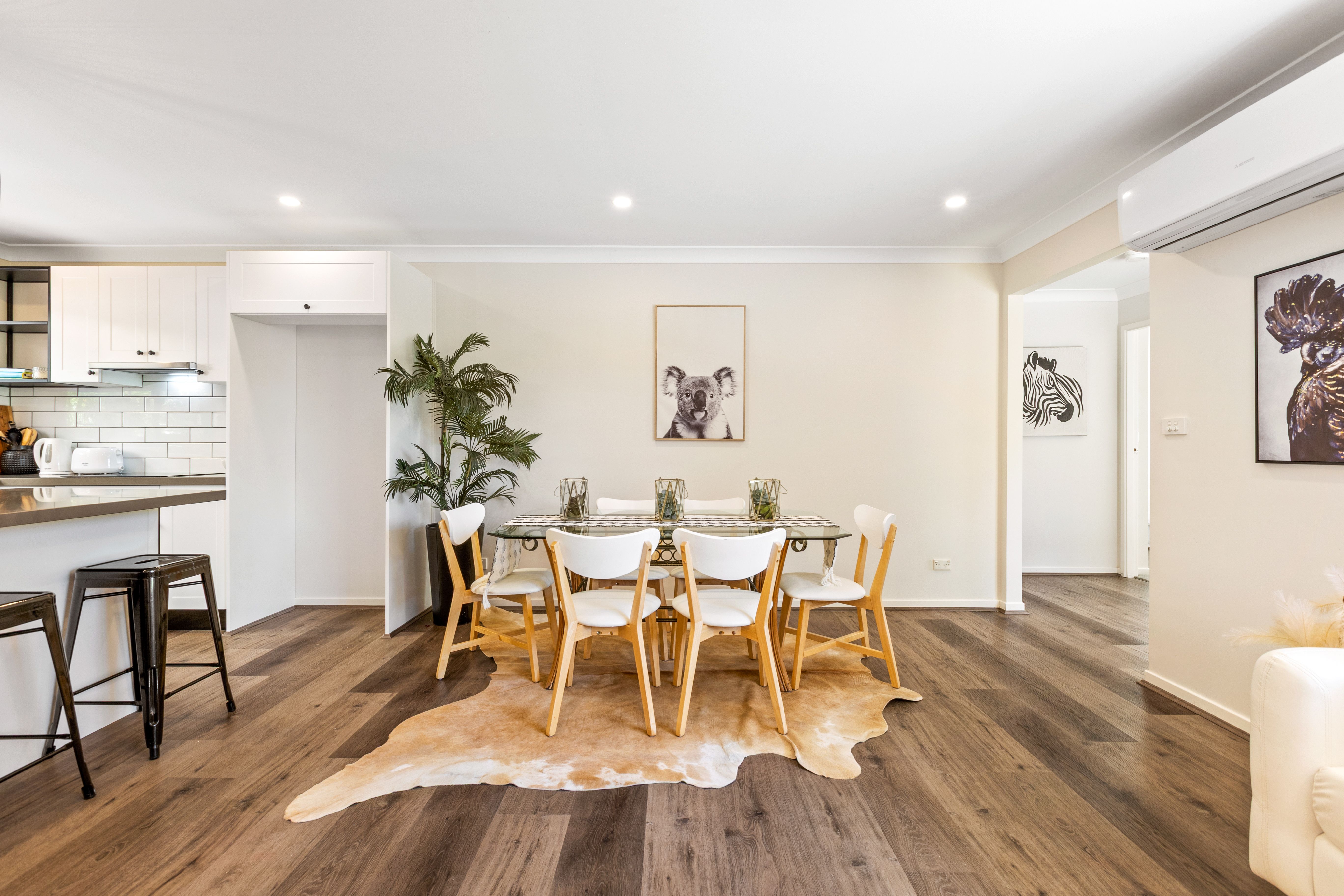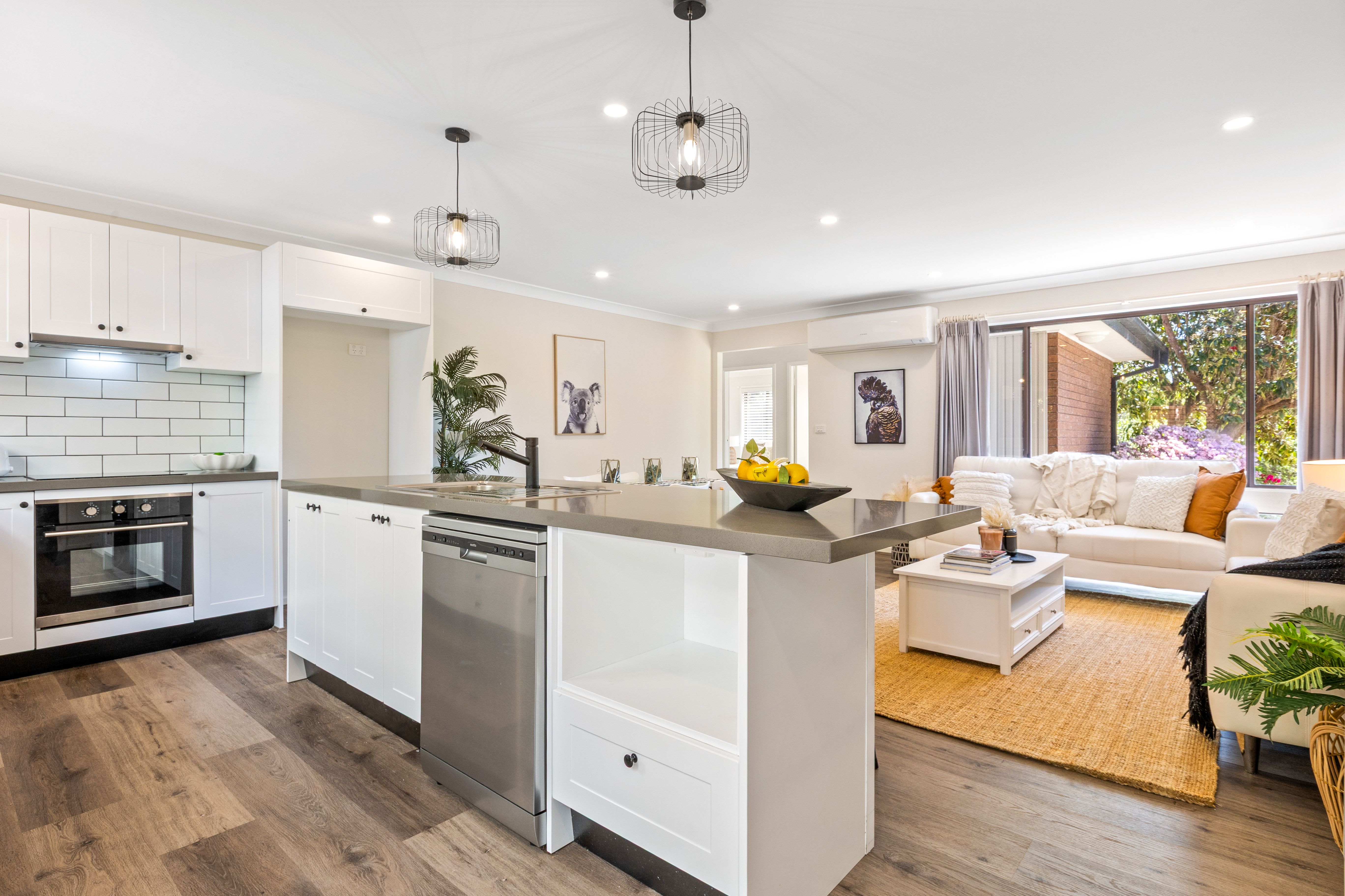 Filled with natural light, the interiors feature a soft neutral palette, warm timber flooring and expansive windows framing leafy outlooks. The spacious open plan living, dining and kitchen space forms the heart of the home, enjoying a bright, elevated view over the front garden. The sleek new kitchen showcases a large central island with feature pendants, stainless steel appliances, expansive stone benchtops, generous storage and a perfectly seamless indoor-outdoor flow with the covered outdoor entertaining area, the ultimate space for gatherings both small and large in all seasons.