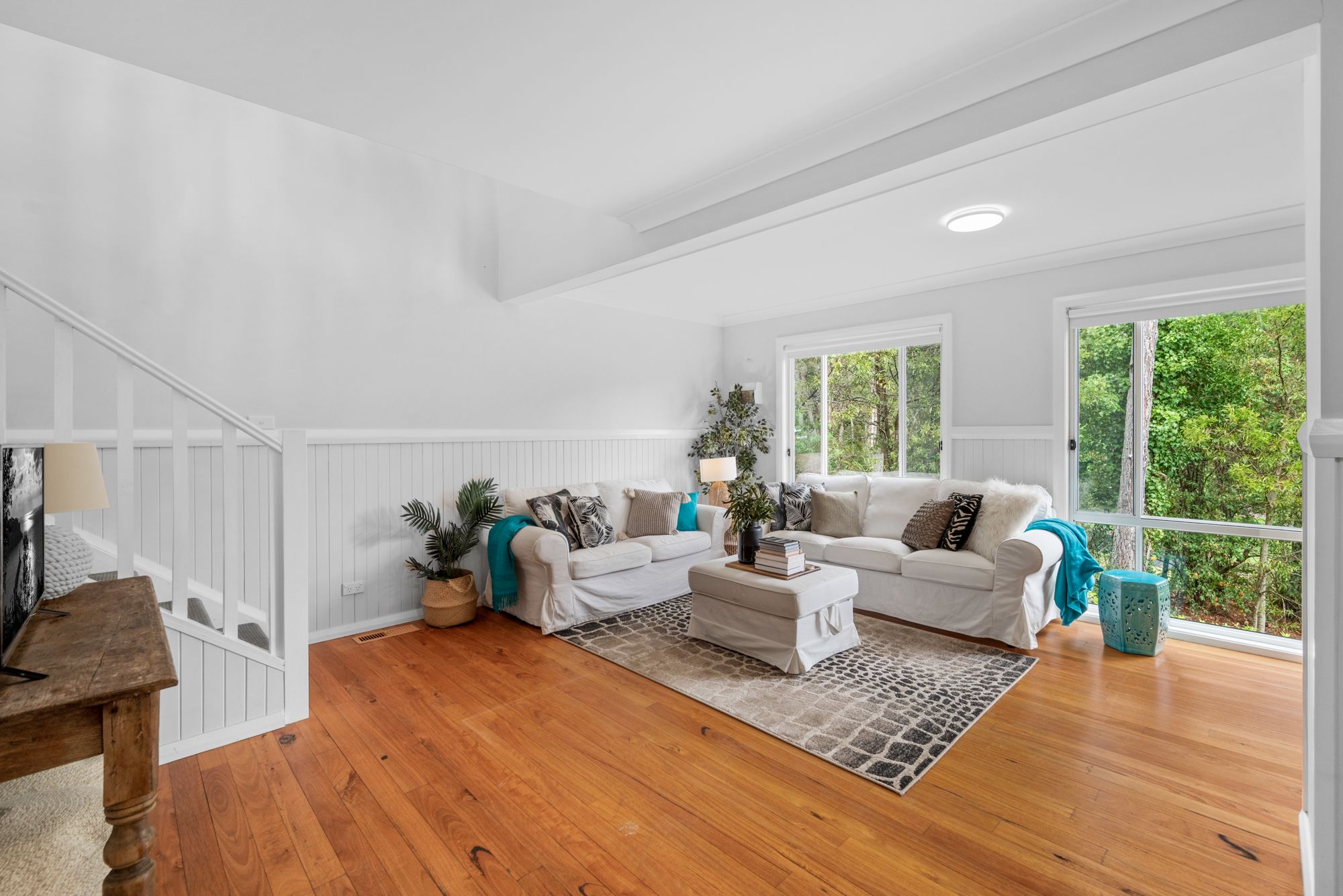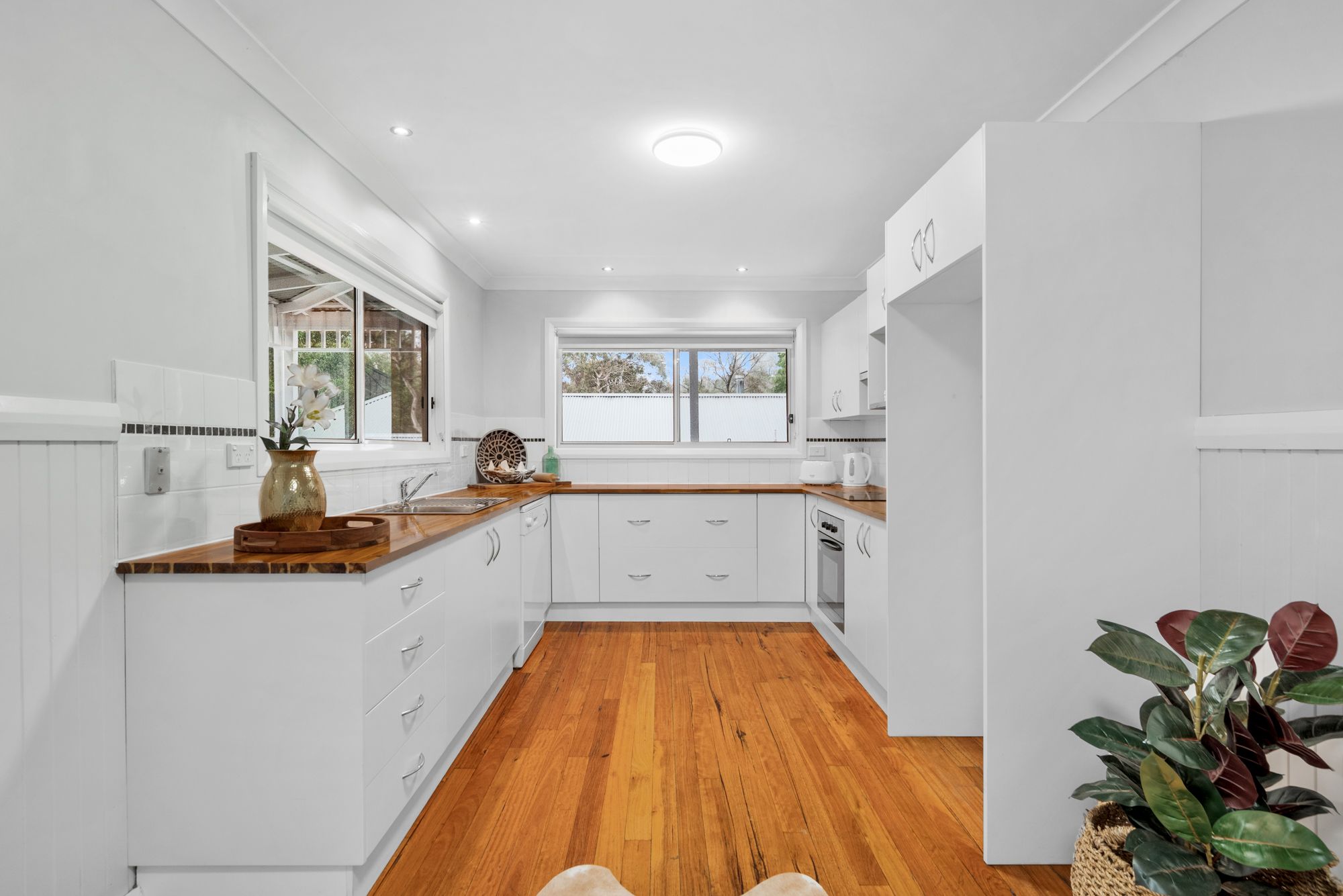 A true wow factor is instant when you arrive, immediately impressing with a fabulous wrap around verandah basked in sunlight. There is a divine colour scheme, with gorgeous timber floorboards, timber lining boards and large windows throughout. These allow the interiors to fill with natural light from the north.
