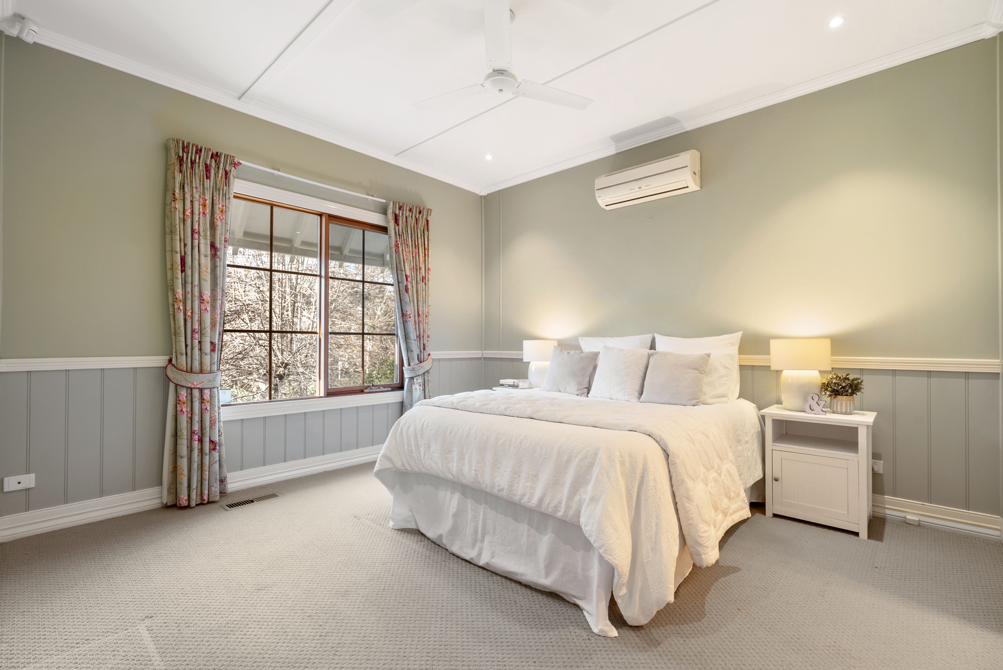 Accommodation includes four bedrooms in the main residence, including a privately set master suite with walk-in robe and a lovely ensuite. Two of the bedrooms, both with built-in robes, wonderfully open to the verandah via French doors. A fourth bedroom / study offers flexibility for working from home or guest accommodation.