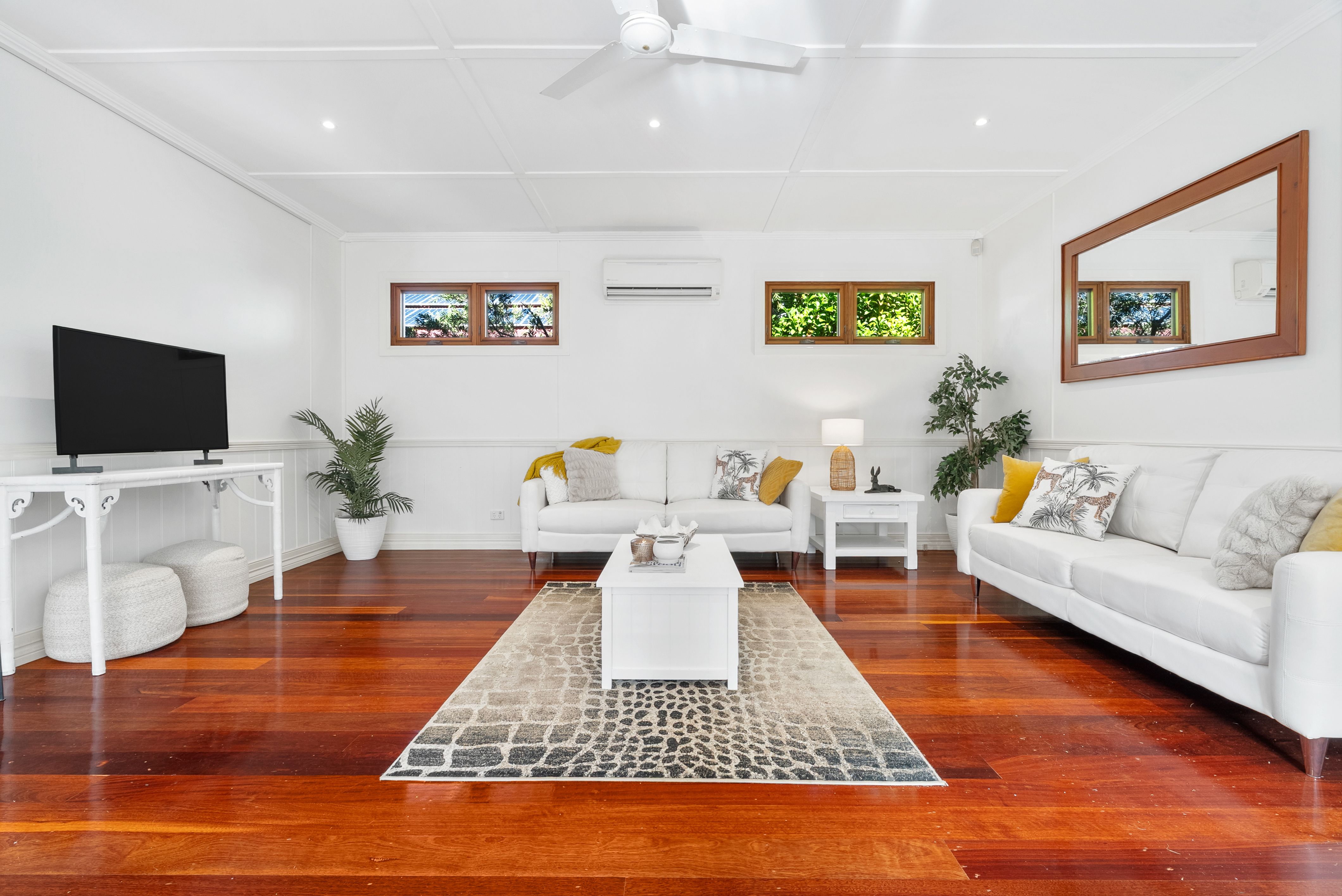 breakfast bar providing an inspiring area to cook and entertain. The home's versatile floorplan includes multiple light-filled living and dining areas that open seamlessly onto fabulous sun-drenched verandah which is perfect for year-round gatherings. High ceilings and polished solid Jarrah floors flow throughout, enhancing the warmth and charm of this delightful home.
